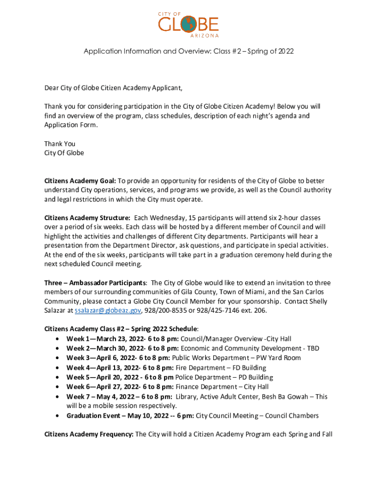 Application Information and Overview: Class #2 Spring of 2022Dear City of Globe Citizen Academy Applicant, Thank you for considering participation in the City of Globe Citizen Academy! Below you will