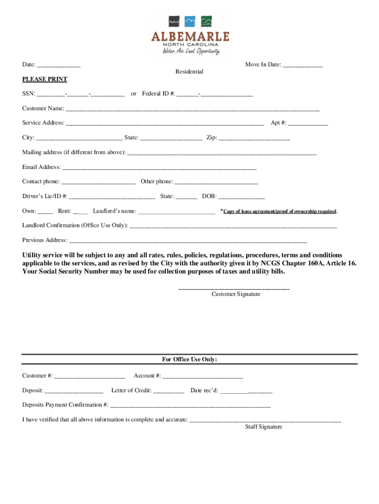 P × 704.984.9615 F × 704.984.9612www.Albemarle.gov PO Box 190 Albemarle, NC 28002Welcome to the City of Albemarle. Enclosed you will find the information for establishing Residential service, required