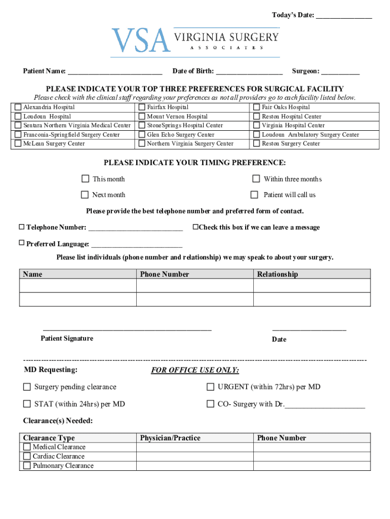 Today's Date: ___Patient Name: ___Date of Birth: ___Surgeon: ___PLEASE INDICATE YOUR TOP THREE PREFERENCES FOR SURGICAL FACILITYPlease check with the clinical staff regarding your preferences as not