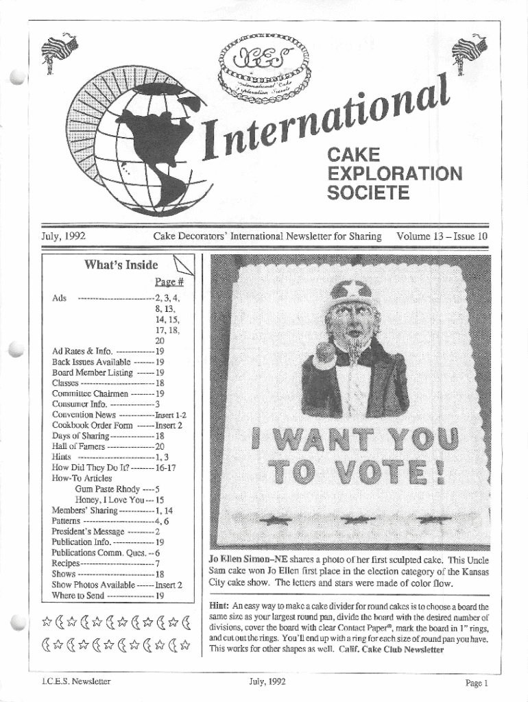 I July 1992 Na tenants fl, CAKE EXPLORATION SOCIETECake Decorators\' International Newsletter for SharingVolume 13 Issue 10What\'s Inside Ads2, 3, 4, 8, 13, 14, 15, 17, 18, 20 Ad Rates & Info. 19