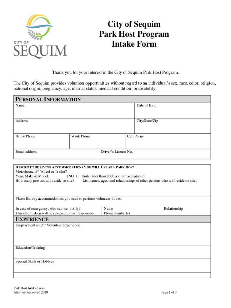 The intake form park host may require information such as personal details, contact information, availability, experience, references, and any other relevant details.
