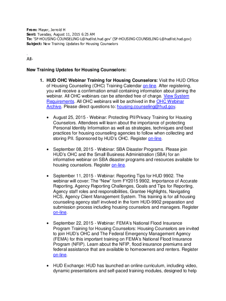 From: Mayer, Jerrold H Sent: Tuesday, August 11, 2015 6:25 AM To: \'SFHOUSINGCOUNSELINGL×duelist.HUD.gov\' (SFHOUSINGCOUNSELINGL×duelist.HUD.gov) Subject: New Training Updates for Housing Counselors.