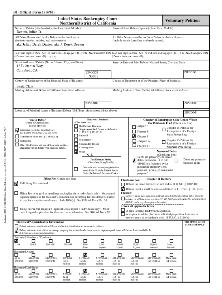 B1 (Official Form 1) (4/10)United States Bankruptcy Court NorthernDistrict of California Name of Debtor (if individual, enter Last, First, Middle):Voluntary Petitionary of Joint Debtor (Spouse) (Last,