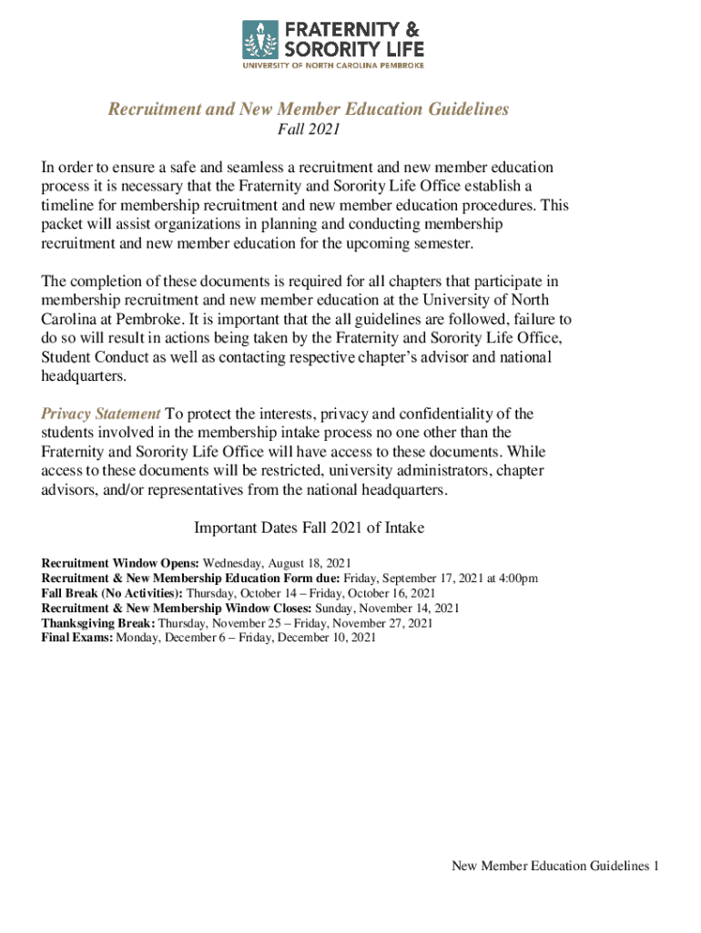 Recruitment and New Member Education Guidelines Fall 2021 In order to ensure a safe and seamless a recruitment and new member education process it is necessary that the Fraternity and Sorority Life