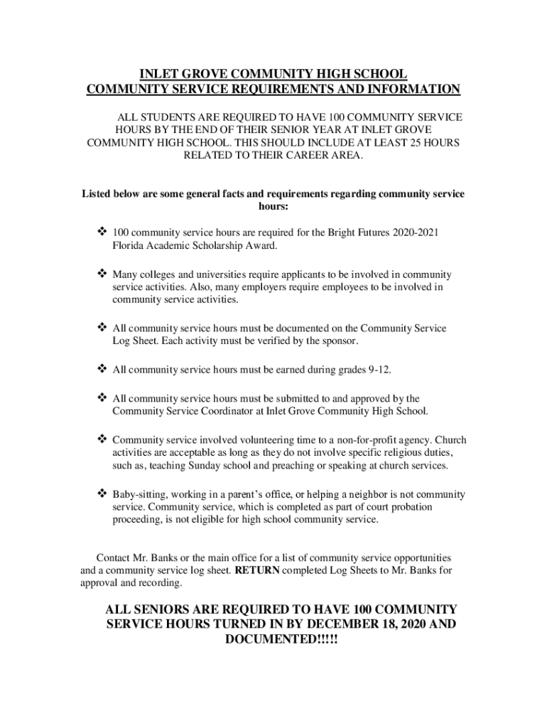 INLET GROVE COMMUNITY HIGH SCHOOL COMMUNITY SERVICE REQUIREMENTS AND INFORMATION ALL STUDENTS ARE REQUIRED TO HAVE 100 COMMUNITY SERVICE HOURS BY THE END OF THEIR SENIOR YEAR AT INLET GROVE COMMUNITY