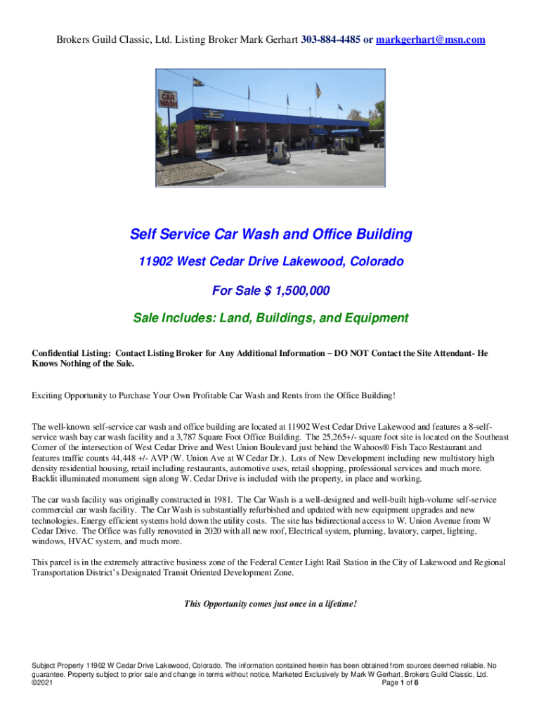 Brokers Guild Classic, Ltd. Listing Broker Mark Ger hart 3038844485 or markgerhart×MSN.himself Service Car Wash and Office Building 11902 West Cedar Drive Lakewood, Colorado For Sale $1,500,000 Sale