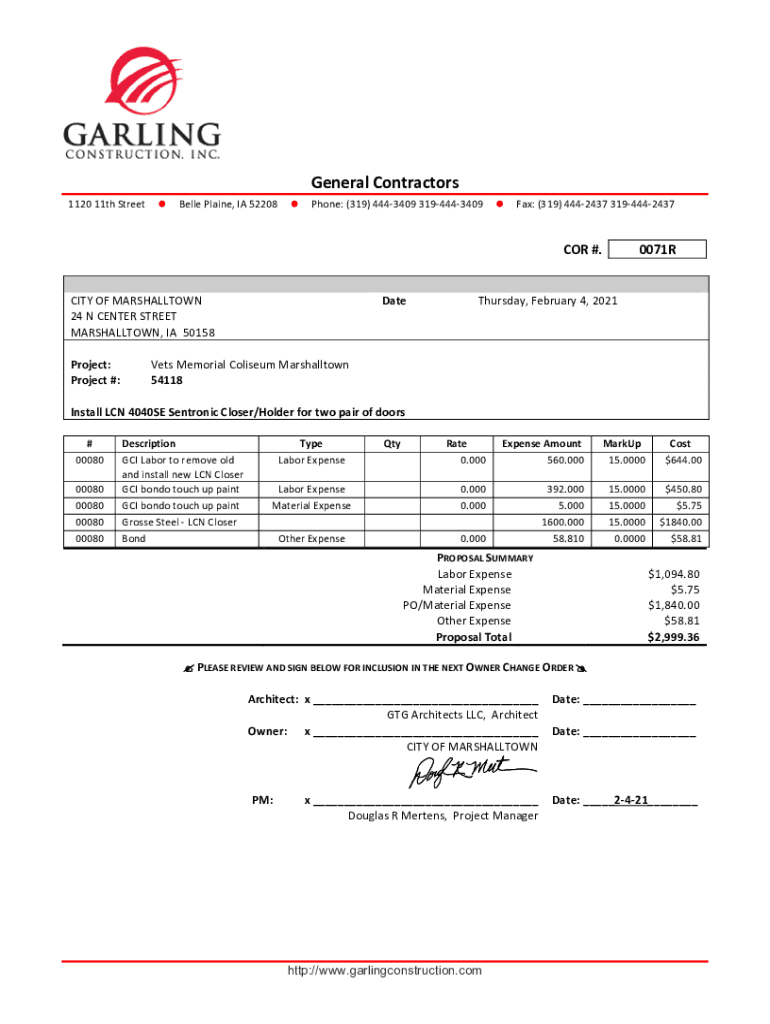 General Contractors 1120 11th StreetBelle Plane, IA 52208Phone: (319) 4443409 3194443409Fax: (319) 4442437 3194442437COR #. Capacity OF MARSHALLTOWN 24 N CENTER STREET MARSHALLTOWN, IA 50158 Project: