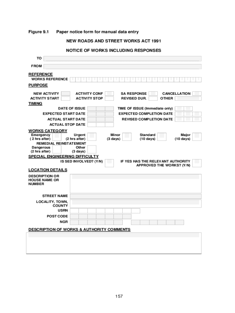 Figure 9.1Paper notice form for manual data entry NEW ROADS AND STREET WORKS ACT 1991 NOTICE OF WORKS INCLUDING RESPONSE STO FROMREFERENCE WORKS REFERENCEPURPOSE ACTIVITY CONE ACTIVITY STONE ACTIVITY