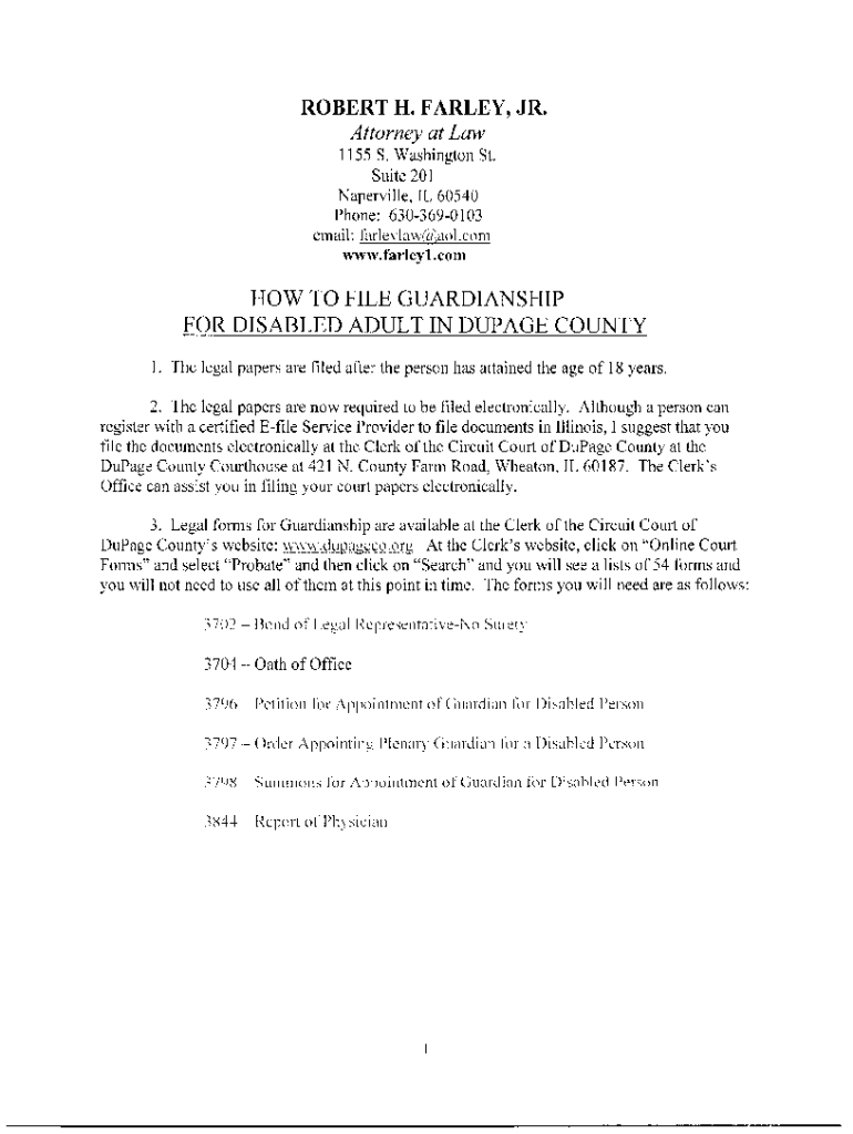 ROBERT H. FARLEY, JR. Attorney at Law 1155 S. Washington St. Suite 201Naperville,IL 60540 Phone: 6303690103 email: Iirrleylawti)aol.com www.farleyl.comHOW TO FILE GUARDIANSHIP FOR DISABLED ADULT IN