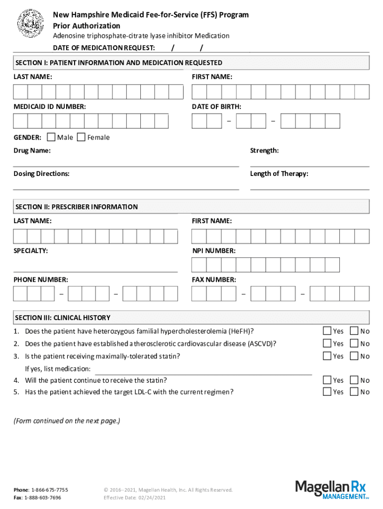 New Hampshire Medicaid FeeforService (FFS) Program Prior Authorization Adenosine triphosphate citrate lyase inhibitor Medication DATE OF MEDICATION REQUEST://SECTION I: PATIENT INFORMATION AND MEDICATION