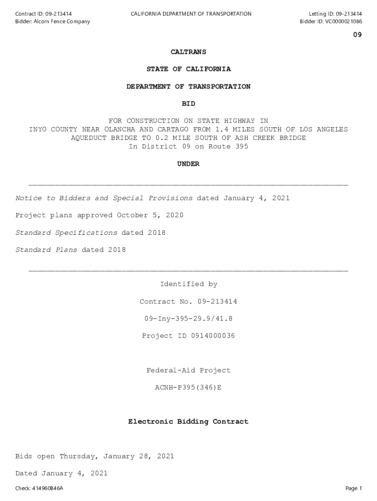 Contract ID: 09213414 Bidder: Acorn Fence CompanyCALIFORNIA DEPARTMENT OF TRANSPORTATIONLetting ID: 09213414 Bidder ID: VC000002108609 COLTRANE STATE OF CALIFORNIA DEPARTMENT OF TRANSPORTATION BID