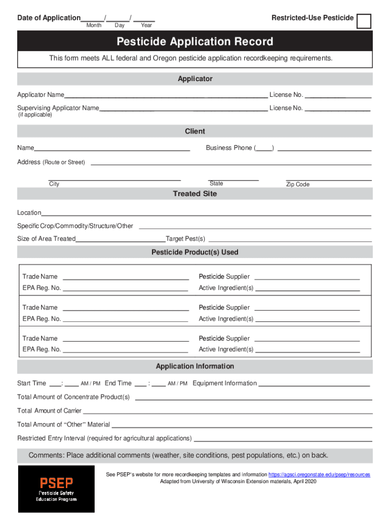 Date of Application/ Month/ DayRestrictedUse Pesticide YearPesticide Application Record This form meets ALL federal and Oregon pesticide application record keeping requirements. Applicator Name ___
