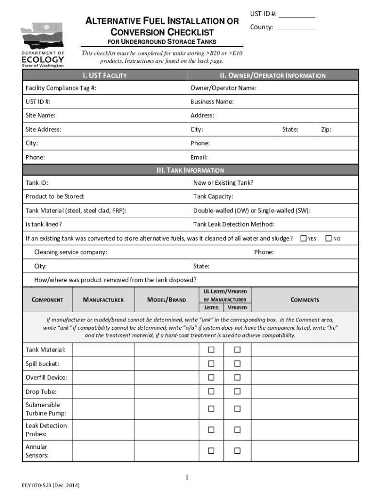 ALTERNATIVE FUEL INSTALLATION OR CONVERSION CHECKLISTS ID #: ___ County: ___FOR UNDERGROUND STORAGE TANKSThis checklist must be completed for tanks storing B20 or E10 products. Instructions are found