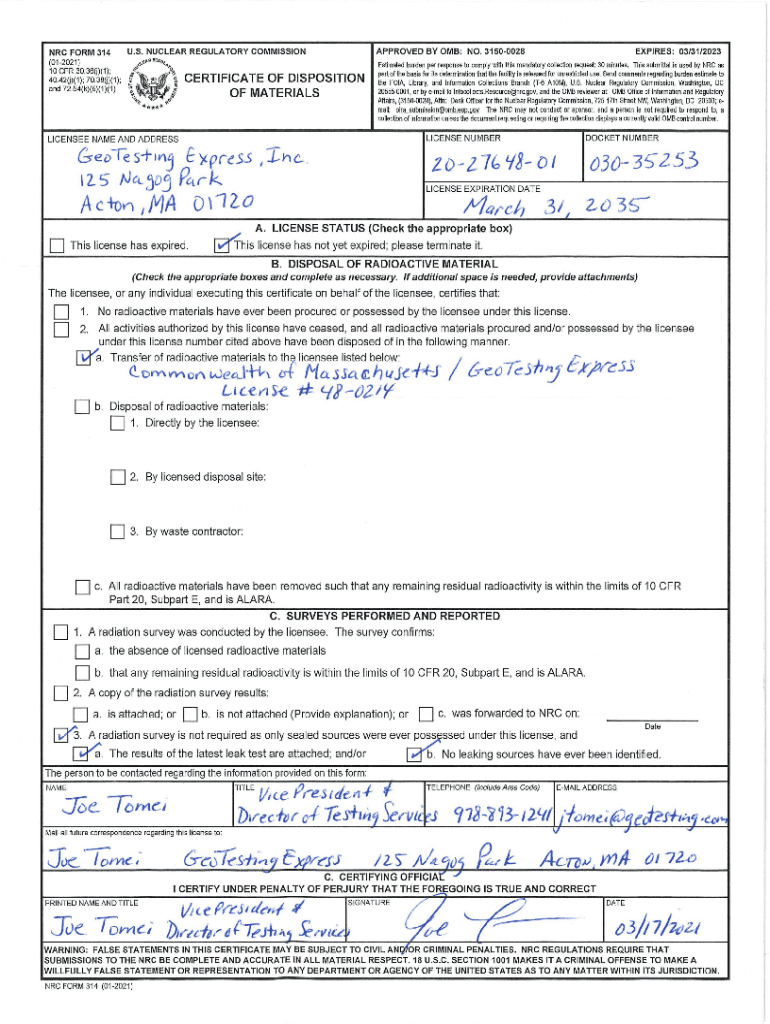Get the free GeoTesting Express, Inc., Termination Request, NRC Form 314 dated 03/17/2021