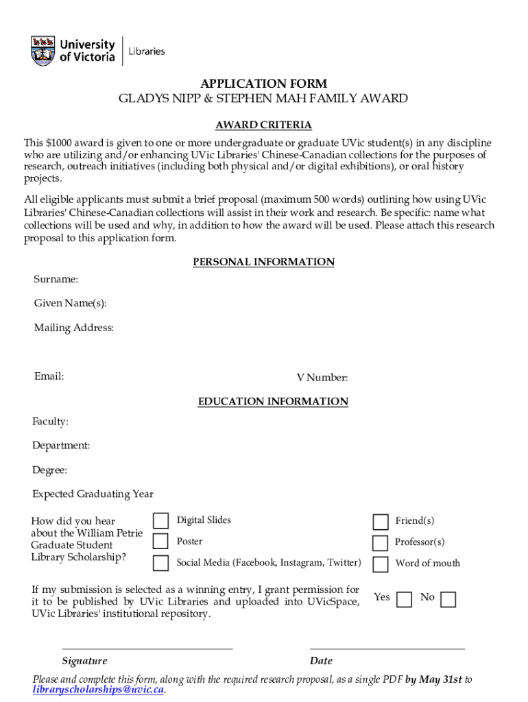 APPLICATION FORM GLADYS IPP & STEPHEN MAH FAMILY AWARD CRITERIA This $1000 award is given to one or more undergraduate or graduate Vic student(s) in any discipline who are utilizing and/or enhancing