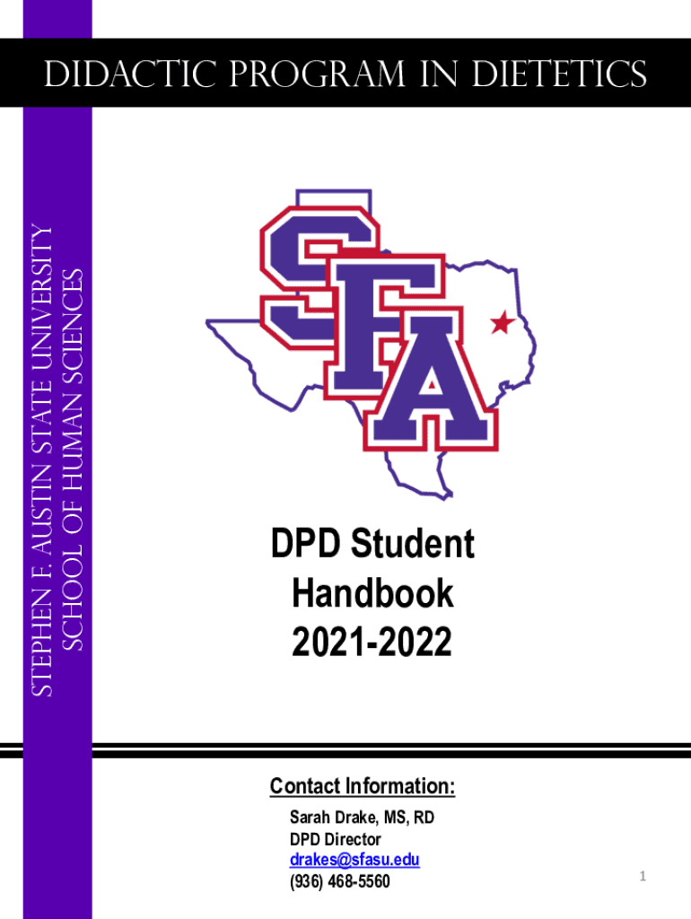 Stephen F. Austin State University School of Human SciencesDidactic Program in Dietetics DPD Student Handbook 20212022Contact Information: Sarah Drake, MS, RD DPD Director drakes×SFSU.edu (936) 46855601Table