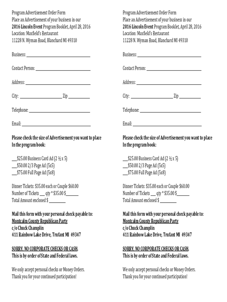 Program Advertisement Order Form Place an Advertisement for your business in our 2016 Lincoln Event Program Booklet, April 28, 2016, Location: Max fields Restaurant 11228 N. Woman Road, Blanchard