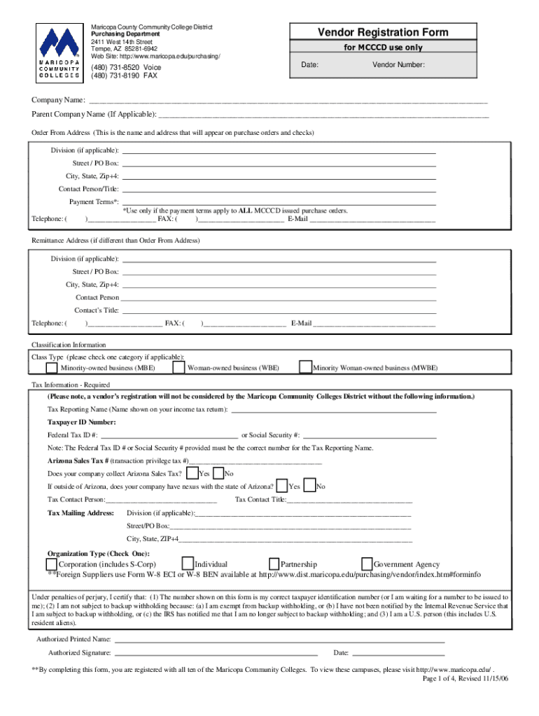 Maricopa County Community College District Purchasing Department 2411 West 14th Street Tempe, AZ 852816942 Website: http://www.maricopa.edu/purchasing/Vendor Registration Form for MC CCD use only