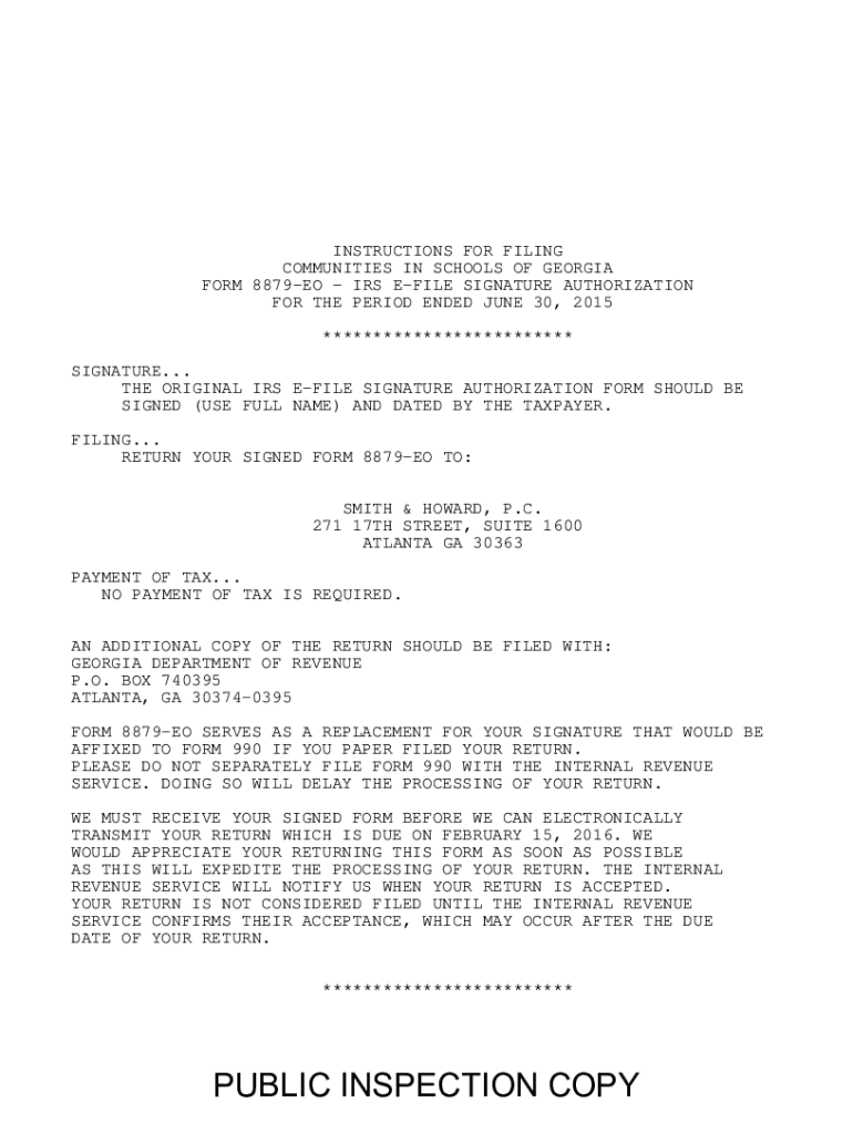 INSTRUCTIONS FOR FILING COMMUNITIES IN SCHOOLS OF GEORGIA FORM 8879EO IRS FILE SIGNATURE AUTHORIZATION FOR THE PERIOD ENDED JUNE 30, 2015 ************************* SIGNATURE... THE ORIGINAL IRS FILE