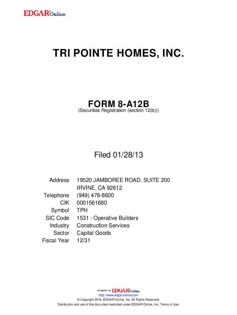 TRI POINT HOMES, INC.FORM 8A12B(Securities Registration (section 12(b)))Filed 01/28/13 Address Telephone CIK Symbol SIC Code Industry Sector Fiscal Year19520 JAMBOREE ROAD, SUITE 200 IRVINE, CA 92612