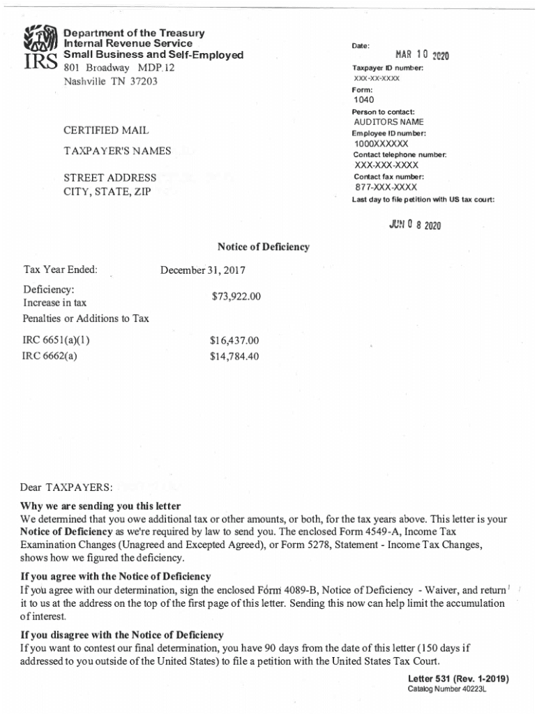 Half/Department of the Treasury Internal Revenue Service Small Business and SelfEmployedIRS 801 Broadway MDP.12 Nashville TN 37203Date:HAD 1 0 2020Taxpayer ID number:xxxxxxxxxForm:1040Person to contact:AUDITORS