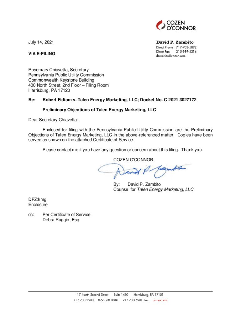 6S9cMNoRJuly 14, 14, 2021 2021David P. Zambia ZambitoVIA FILING VIA E EFILINGDirect Phone 7177035892 7177035892 Direct Phone Direct Fax 2159894216 Direct Fax 2159894216 Zambia×cozen.com DZA mbitotkozen.