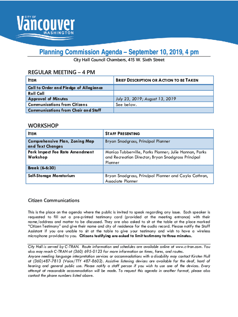 Planning Commission Agenda September 10, 2019, 4 pm City Hall Council Chambers, 415 W. Sixth StreetREGULAR MEETING 4 PM ITEM Call to Order and Pledge of Allegiance Roll Call Approval of Minutes Communications