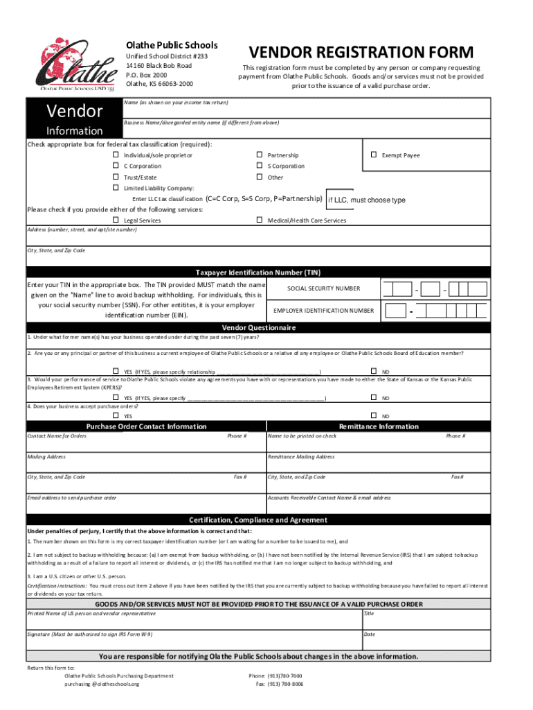 OlathePublicSchoolsVENDORREGISTRATIONFORMUnifiedSchoolDistrict×233 14160 Blackboard P.O. Box2000 Olathe,KS660632000Thisregistrationformmustbecompletedbyanypersonorcompanyrequesting payment from OlathePublicSchools.