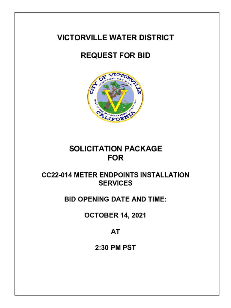 VICTORVILLE WATER DISTRICT REQUEST FOR SOLICITATION PACKAGE FOR CC22014 METER ENDPOINTS INSTALLATION SERVICES BID OPENING DATE AND TIME: OCTOBER 14, 2021, AT 2:30 PM VICTORVILLE WATER DISTRICT CC22014