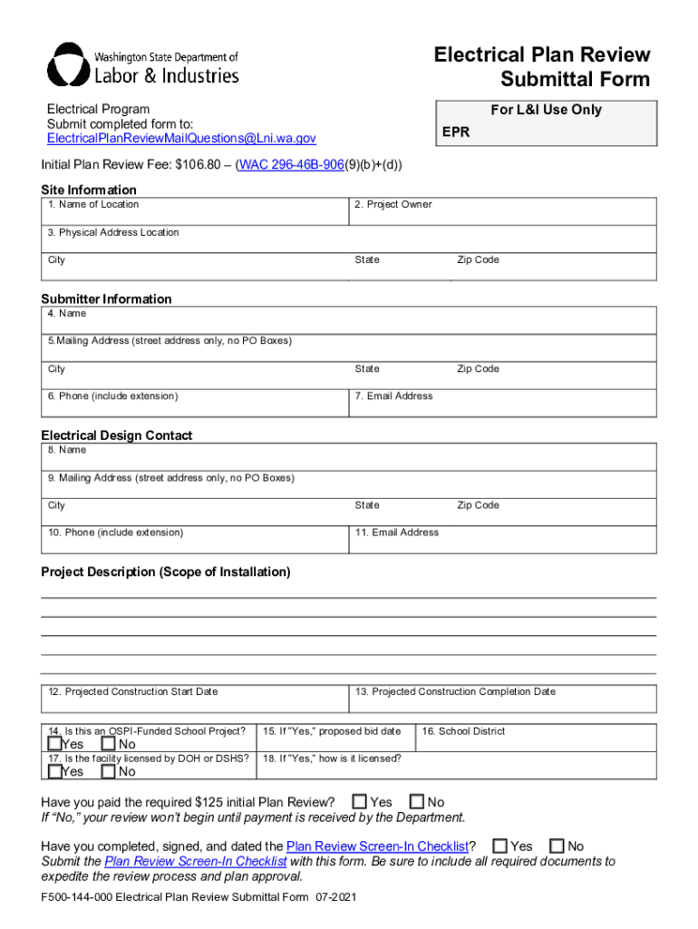 Electrical Plan Review Submittal Form For L&I Use Nonelectrical Program Submit completed form to: ElectricalPlanReviewMailQuestions×LNI. Wei.govEPRInitial Plan Review Fee: $106.80 (WAC 29646B906(9)(b)+(d))