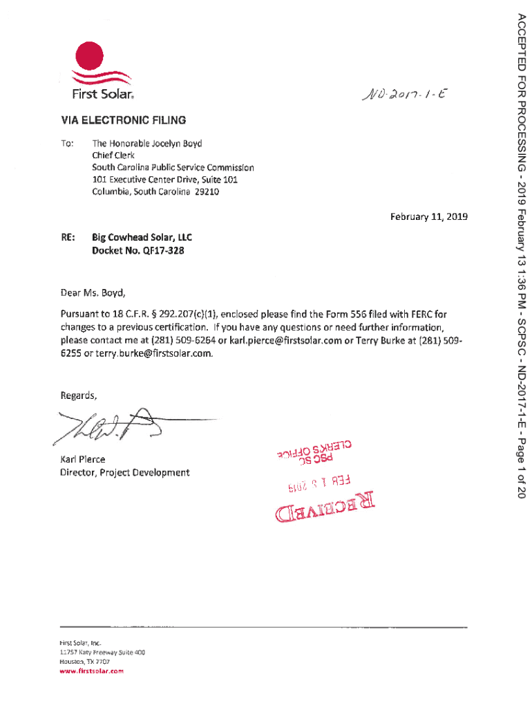 VIA ELECTRONIC FILING To:The Honorable Jocelyn Boyd Chief Clerk South Carolina Public Service Commission 101 Executive Center Drive, Suite 101 Columbia, South Carolina 29210February 11, 2019 RE:Big