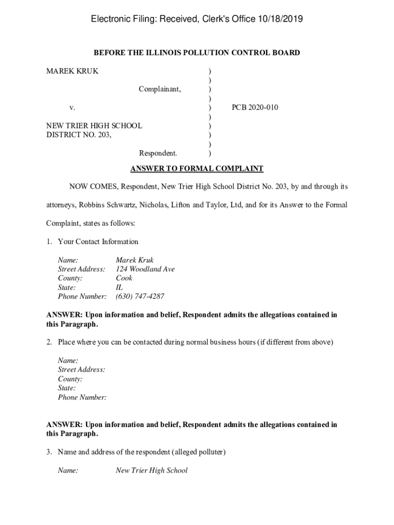 Electronic Filing: Received, Clerk\'s Office 10/18/2019BEFORE THE ILLINOIS POLLUTION CONTROL BOARD MAREK KR UK Complainant, v. NEW TRIER HIGH SCHOOL DISTRICT NO. 203, Respondent.) )))))))))PCB 2020010ANSWER