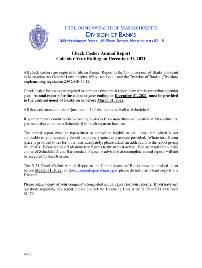 PDF Massachusetts check casher is a form that must be filed by businesses operating as check cashing services in the state of Massachusetts.