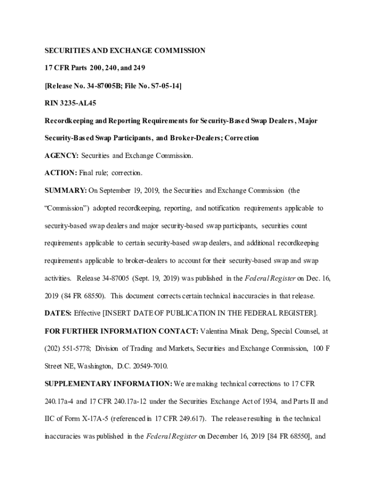 SECURITIES AND EXCHANGE COMMISSION 17 CFR Parts 200, 240, and 249 [Release No. 3487005B; File No. S70514] IN 3235AL45 Record keeping and Reporting Requirements for SecurityBased Swap Dealers, Major