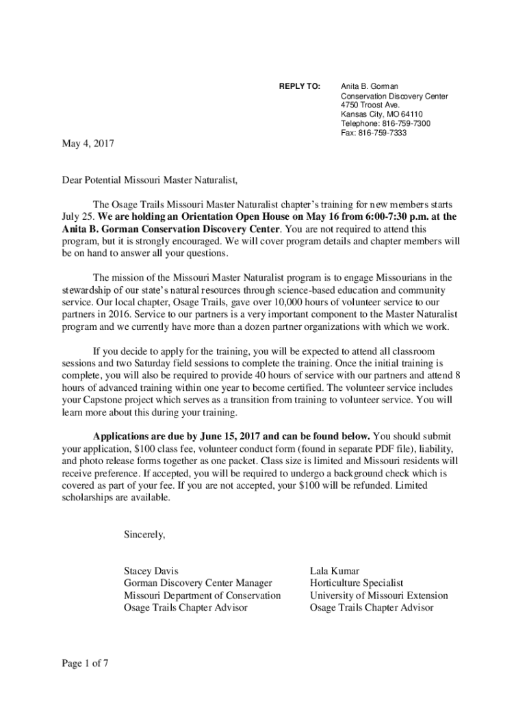 REPLY TO:Anita B. Gorman Conservation Discovery Center 4750 Roost Ave. Kansas City, MO 64110 Telephone: 8167597300 Fax: 8167597333May 4, 2017Dear Potential Missouri Master Naturalist, The Osage Trails