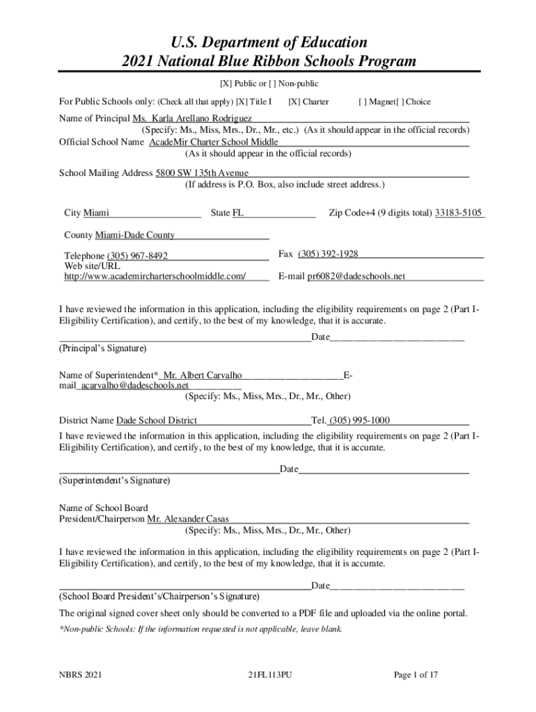 U.S. Department of Education 2021 National Blue Ribbon Schools Program [X] Public or [ ] Nonpublic Public Schools only: (Check all that apply) [X] Title I×X] Charter[ ] Magnet[ ] ChoiceName of Principal