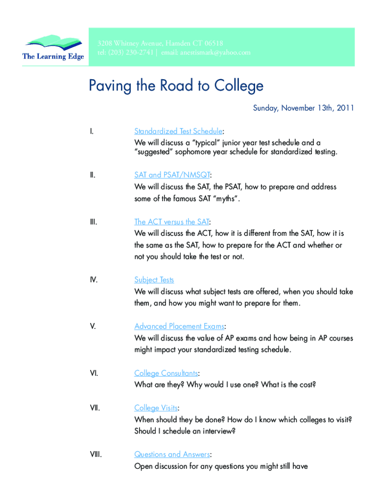 3208 Whitney Avenue, Hamden CT 06518 tel: (203) 2302741 | email: anestismark×yahoo.comparing the Road to College Sunday, November 13th, 2011I. Standardized Test Schedule:We will discuss a typical