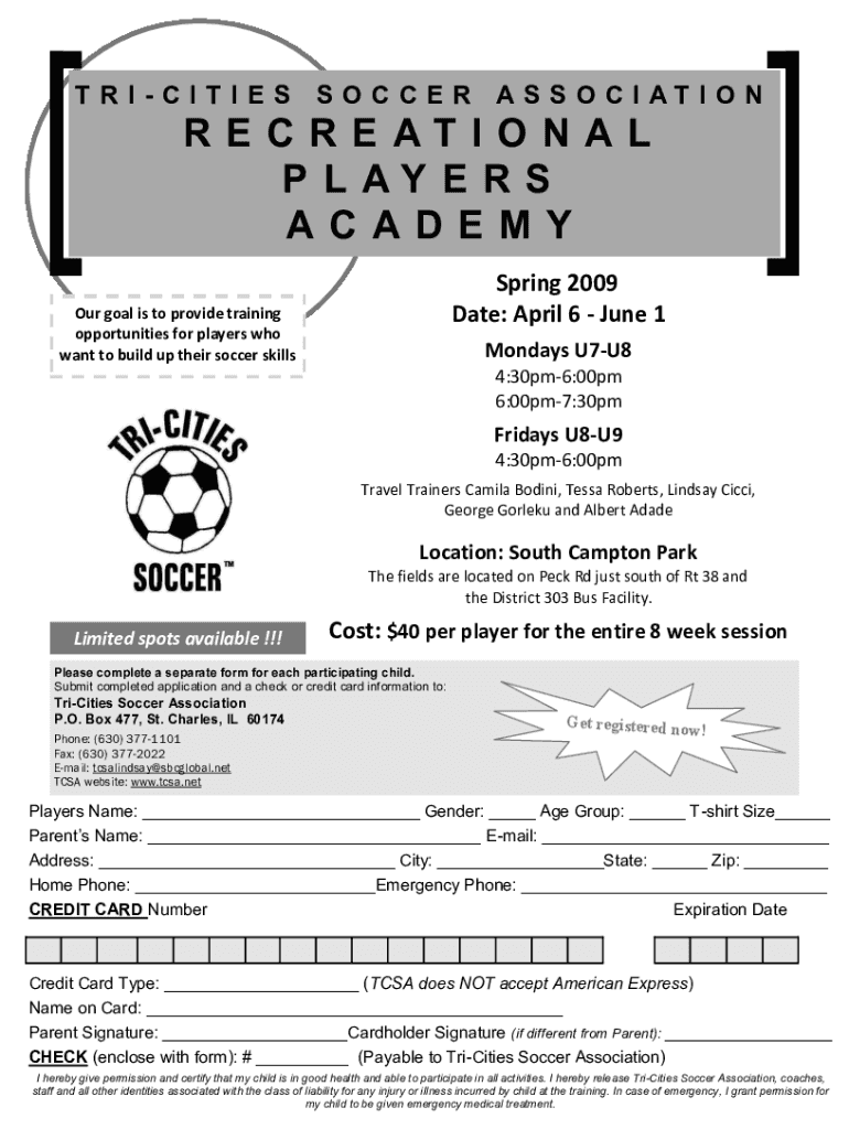 TRICITIESSOCCERAS S O C I AT I ON RECREATIONAL P LAY E R S ACADEMY Spring 2009 Date: April 6 June 1Our goal is to provide training opportunities for players who want to build up their soccer skills