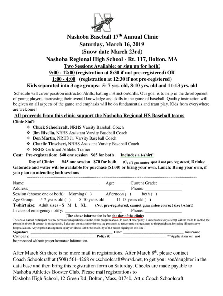 Nashua Baseball 17th Annual Clinic Saturday, March 16, 2019 (Snow date March 23rd) Nashua Regional High School Rt. 117, Bolton, MA Two Sessions Available: or sign up for both! 9:00 12:00 (registration