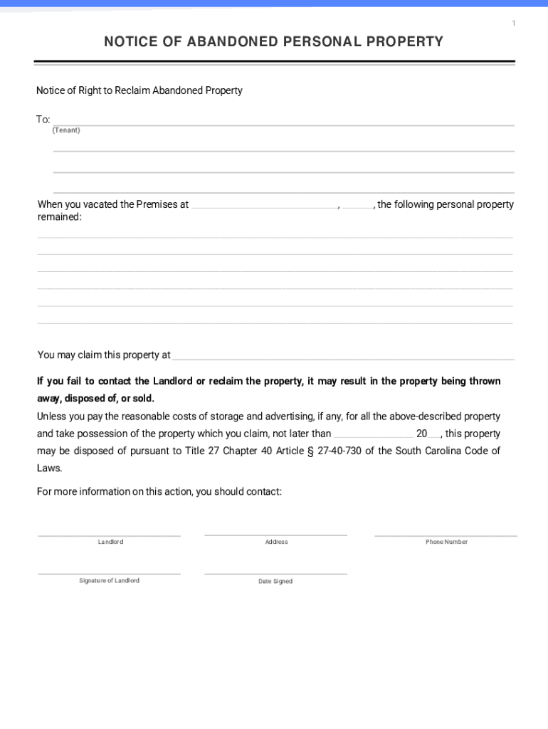 Get the free NOTICE OF RIGHT TO RECLAIM ABANDONED PERSONAL PROPERTY