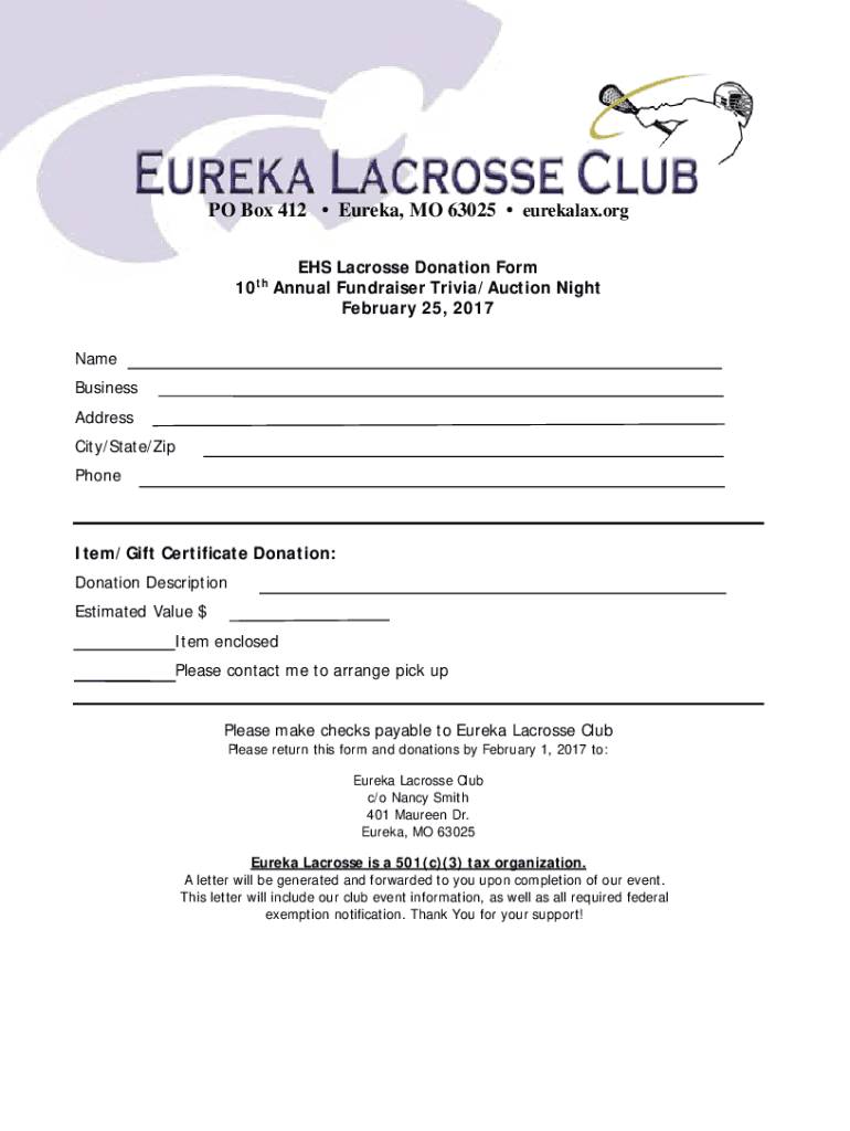 PO Box 412 Eureka, MO 63025 eureka lax.org10thEHS Lacrosse Donation Form Annual Fundraiser Trivia/Auction Night February 25, 2017Name Business Address City/State/Zip Phonetic/Gift Certificate Donation: