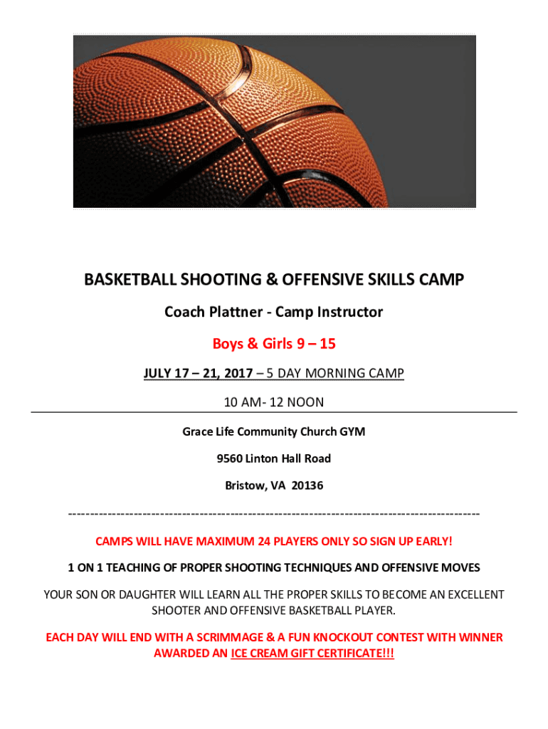 BASKETBALL SHOOTING & OFFENSIVE SKILLS CAMP Coach Platter Camp Instructor Boys & Girls 9 15 JULY 17 21, 2017 5 DAY MORNING CAMP 10 AM 12 NOON Grace Life Community Church GYM 9560 Linton Hall Road