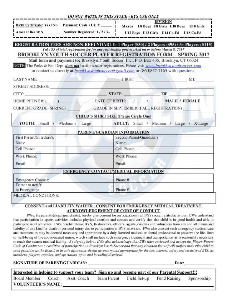 DO NOT WRITE IN THIS SPACE BYS USE ONLY Birth Certificate: Yes / Nonpayment: Cash / Ck. #:___Amount Recd: $___Number Registered: 1 / 2 / 3+DIVISION U8 Boys U8 Girls U10 BoysMicrosU12 Boys U12 GirlsU14