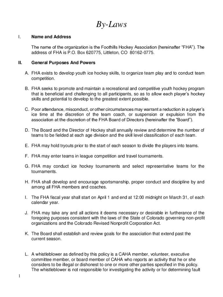 Bylaws I. Name and Address The name of the organization is the Foothills Hockey Association (hereinafter FHA). The address of FHA is P.O. Box 620775, Littleton, CO 801620775.II. General Purposes And