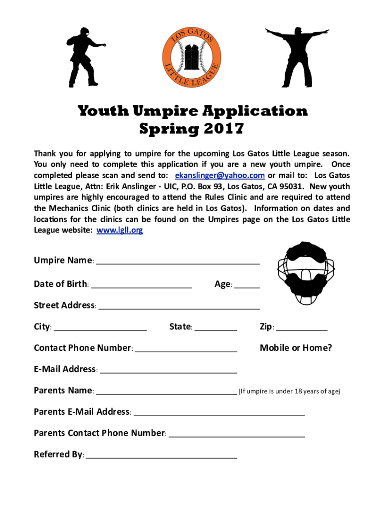 Youth Umpire Application Spring 2017 Thank you forapplyingto umpirefortheupcomingLosGatosLi7leLeagueseason. Youonlyneedtocompletethisapplica;onifyouareanewyouthumpire. Once completed please scan and