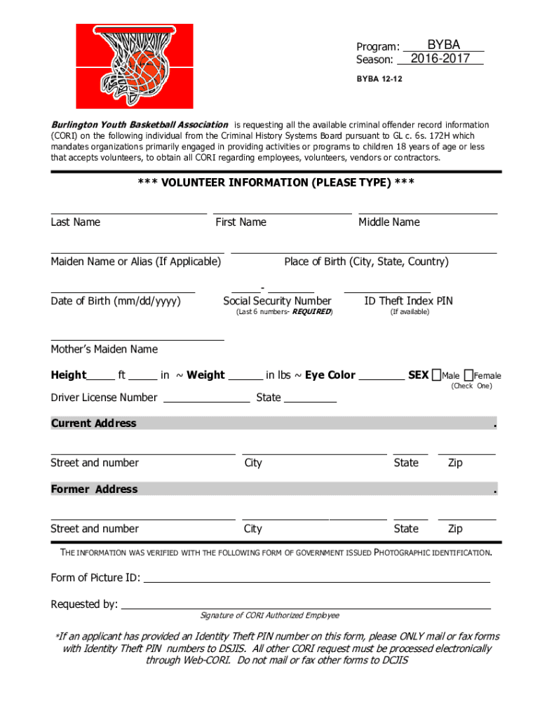 BBA Program: ___ 20162017 Season: ___ BBA 1212Burlington Youth Basketball Association is requesting all the available criminal offender record information (CORI) on the following individual from the
