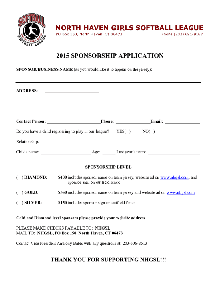 NORTH HAVEN GIRLS SOFTBALL LEAGUE PO Box 150, North Haven, CT 06473Phone (203) 69191672015 SPONSORSHIP APPLICATION SPONSOR/BUSINESS NAME (as you would like it to appear on the jersey):ADDRESS:___