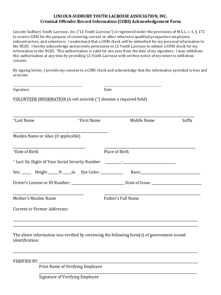 LINCOLNSUDBURYYOUTHLACROSSEASSOCIATION, INC. CriminalOffenderRecordInformation(CORI)AcknowledgementFormLincolnSudburyYouthLacrosse, Inc.(LSYouthLacrosse)isregisteredundertheprovisionsofM. G.L.c.6,172
