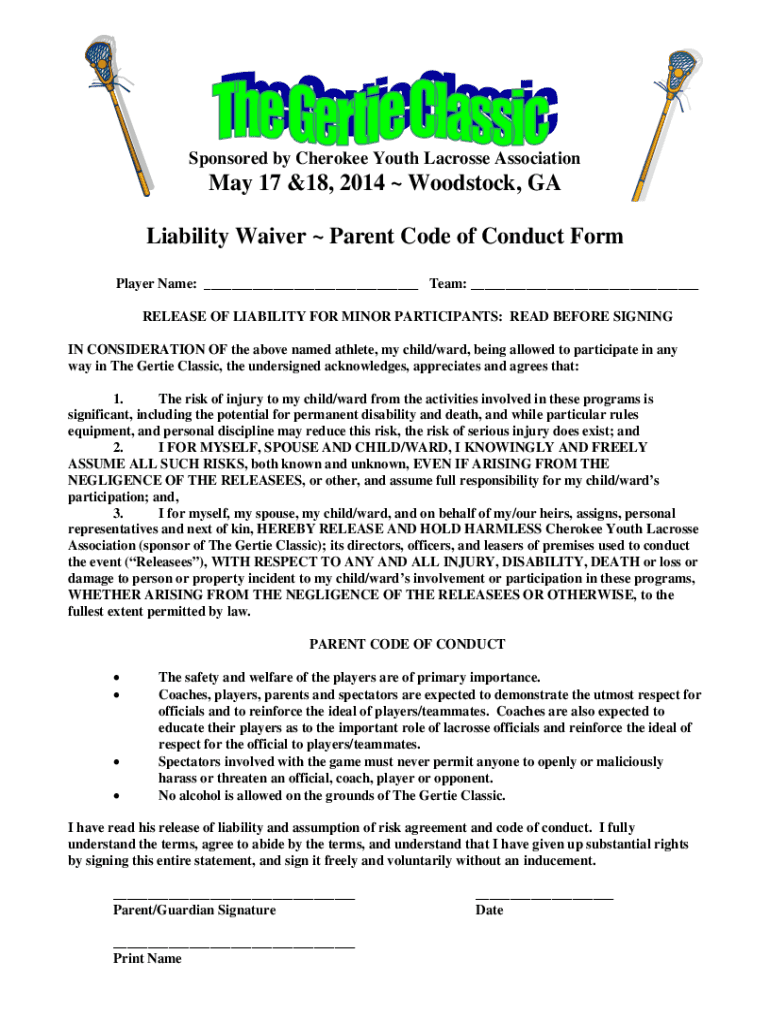 Sponsored by Cherokee Youth Lacrosse Association May 17 &18, 2014 Woodstock, GA Liability Waiver Parent Code of Conduct Form Player Name: ___ Team: ___ RELEASE OF LIABILITY FOR MINOR PARTICIPANTS: