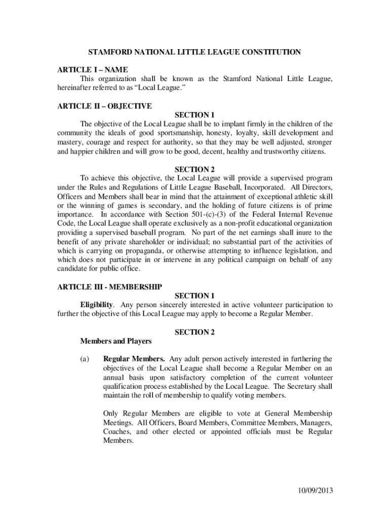 STAMFORD NATIONAL LITTLE LEAGUE CONSTITUTION ARTICLE I NAME This organization shall be known as the Stamford National Little League, hereinafter referred to as Local League. ARTICLE II OBJECTIVE SECTION